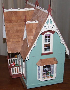 This is Kerry's DollhouseKerry is my daughter, she gave me a dollhouse kit for my last birthday. Kerry loved this little house, and said it made her think of the summer cottage she has always wanted. I decided to make it into a miniature of her dream cottage. This house kit is the Orchid by Greenleaf. I am more familiar with building houses from scratch, but I had made a couple of Greenleaf dollhouses before I made this one. This dollhouse is much cuter on the exterior than the houses I make from scratch. I love all the fancy gingerbread trim. I figured my daughter would want to keep it in the living room, so I chose some paint colors which would fit into the decor. |