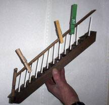 and then cut 14 lengths at 2 5/8 each Almost finished now, this next part is a bit fiddley-diddley.Glue the railing to the newel post and to the top of the spindles. Gently push the spindles and railing together, so that the spindles are glued to the piece of 1/16x1/16balsa wood and to the underside of the railing. I have never found an easy way to clamp this, I confess to holding it with both hands for about 30 minutes. |