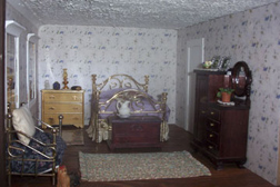 The master bedroom on the second floor. There is a lot of room for furniture in second floor bedrooms. You can see the ceiling in this picture. I plastered the ceiling with Polyfilla , it adds a little depth to the dollhouse. If you want this look, be sure to do the plastering before you assemble the house. |